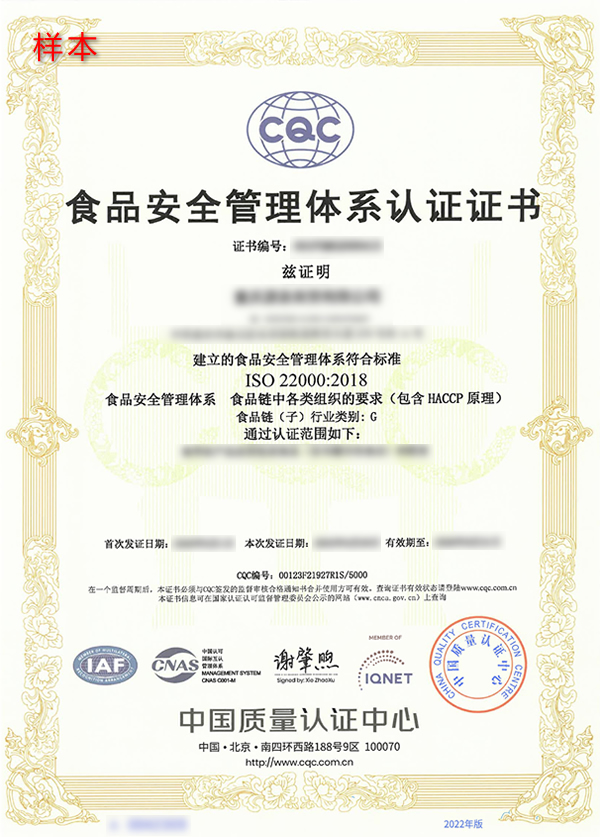ISO 22000食品安全管理体系FSMS认证证书