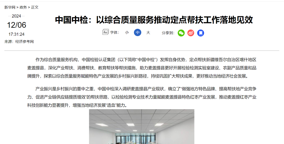 近日,新华网、新华网客户端刊发文章《中国中检:以综合质量服务推动定点帮扶工作落地见效》,全面展现中国中检助力乡村振兴的新路径、新成果。全文如下: